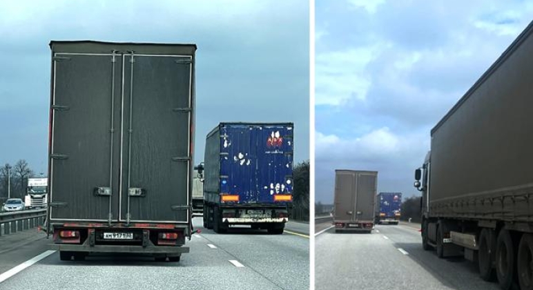 В лучшем случае, фуры двигаются одним рядом колес по центру правой полосы, а другим по обочине. Что чрезвычайно опасно, особенно на мокрой дороге.